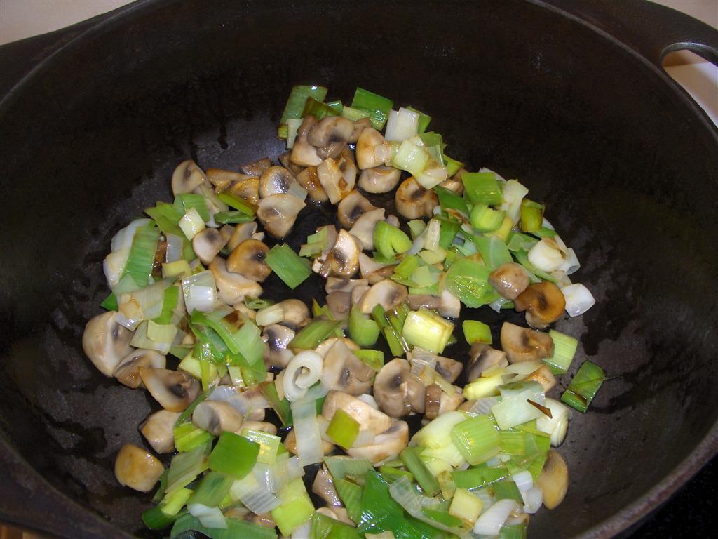 ...och det här ska bli kycklinggryta så småningom. Det som syns på den här bilden är färsk stekt champinjon och en liten purjolök i tjocka strimlor.